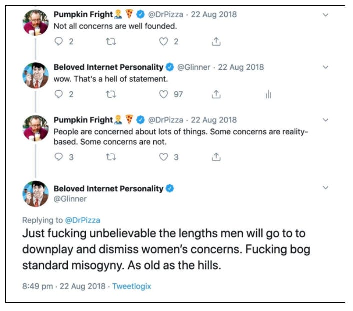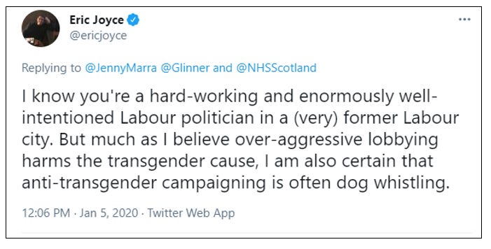 He sneered at feminists’ objecting to trans-identified males using female-only spaces, labelling their concerns ‘fact-free drivel’ and ‘fearmongering’.