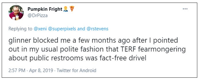 Bright was an Ars Technica reporter who tweeted under the handle @DrPizza. He was a vocal advocate of allowing men into women’s bathrooms and changing rooms.