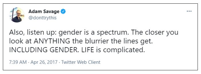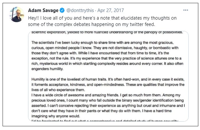 He then compounded his adherence to gender identity ideology by making a ‘statement’, ie five rambling paragraphs, which presents no proof to validate his opinions. "The published science on gender identity is not something I'm able to immerse myself in right now..." With some generalisations about "The panoply of possibilities" Savage concluded to keep an open mind. Unusual, given that he used to host a science-based television programme which explored the validity of popular fallacies.