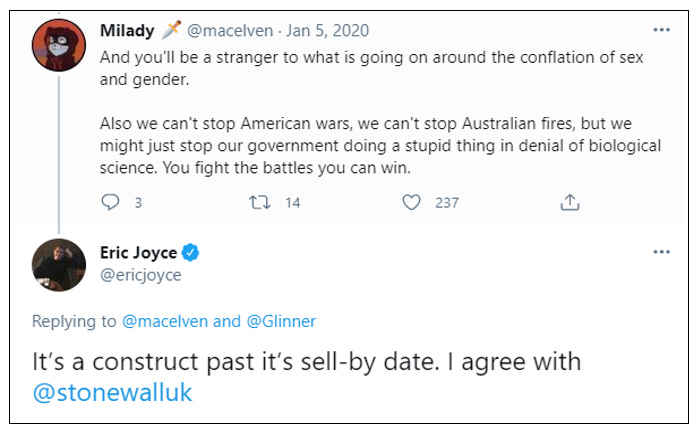 He described biological sex as ‘a construct past it’s [sic] sell-by date’ and stated that he agreed with Stonewall.