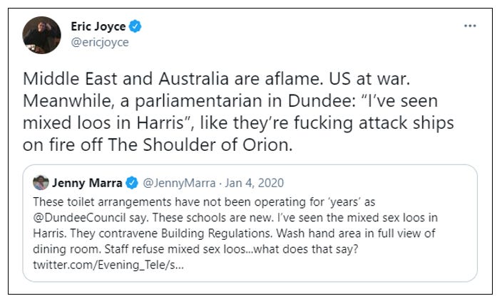 Former Labour MP, Eric Joyce, poured scorn on Jenny Marra’s concerns over the mixed sex toilets at a school in Dundee.