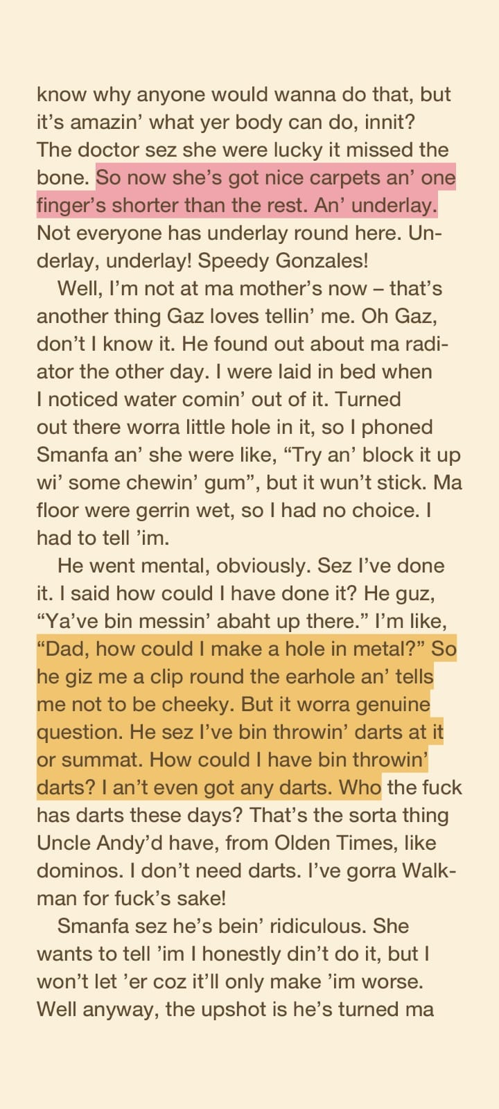 This is the strongest criticism she can manage. “It does, however, ramble in places, while the racist slurs directed at Black and Asian people are glossed over in a way that makes you question why they were even mentioned.” Talk about trans privilege! Can you imagine Martin Amis getting away that lightly!? But I suppose Amis doesn’t have the moral authority that comes with holding a man at gunpoint and then doing bird for it!