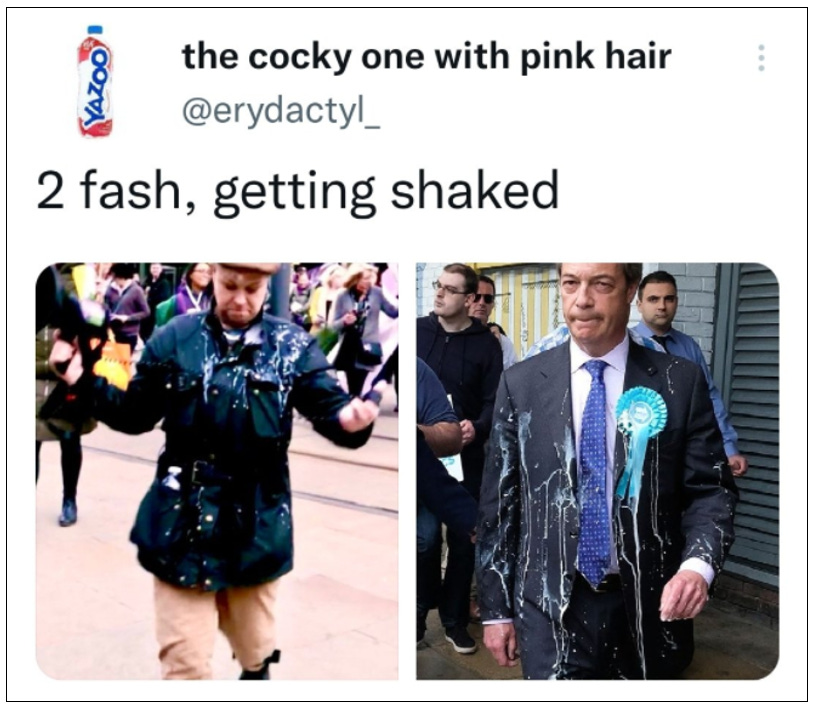 She was leading the chanting at the vigil when a milkshake was thrown over her from behind. Witnesses described ‘a man with pink hair wearing a dress’ fleeing the scene.
