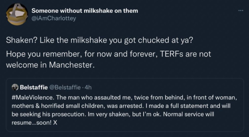 I spoke to Gemma following the incident on Saturday and she outlined what had happened to her. About halfway through the vigil, the pink-haired male, with whom she’d had no previous interaction, threw a milkshake in her face.