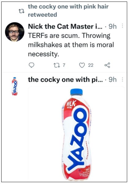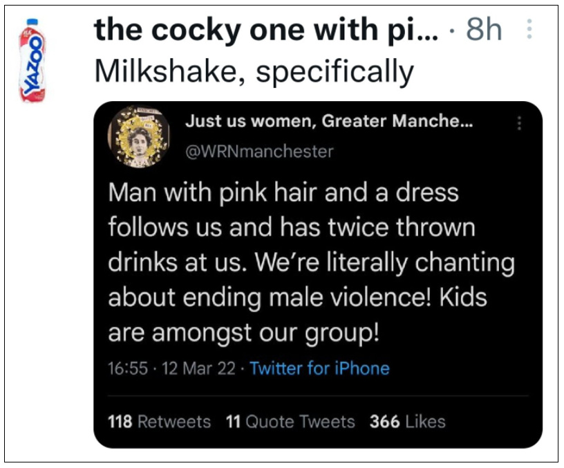 See also Maria MacLachlan's video: Another day, another trans activist bully, another feminist assaulted - YouTube
