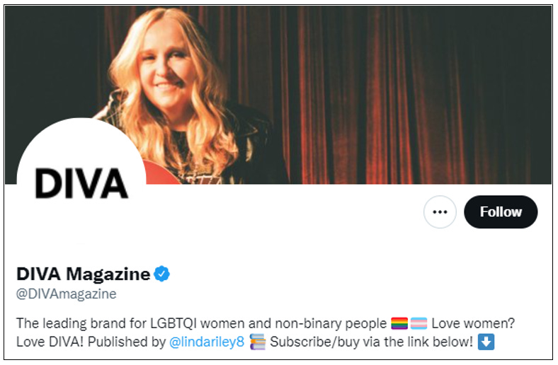 Diva magazine, founded in 1994, was originally intended to be a ‘mainstream lesbian magazine’. But now, published by Linda Riley, it bills itself as a ‘leading brand’ for ‘LGBTQI women and non-binary people’ and its target demographic includes males.