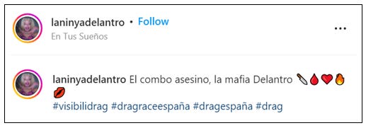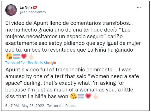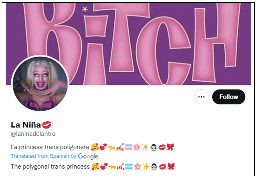 The young man at the centre of this story from Castellón, Spain, calls himself Aurora Ibanez. He uses the social media handle @laninadelantro (ie ‘the girl of the joint’) and the name ‘La Niña’ (ie ‘The Girl’).