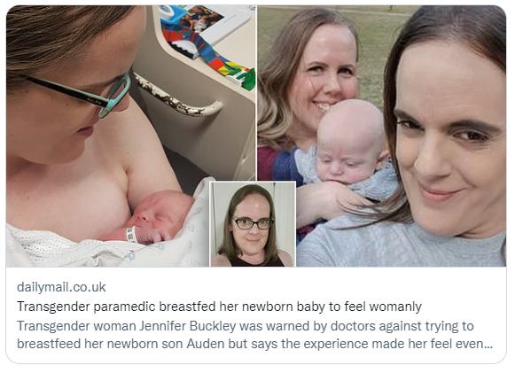 Using a baby to validate a male’s delusions of womanhood, despite risks to the infant’s health, is not without precedent. Read this account by Dana Fried (below), in which he describes ‘feeding’ his baby daughter immediately after his wife had given birth.