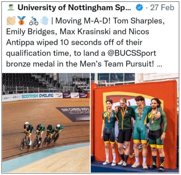 In 2020, aged nineteen, Bridges began ‘identifying as a woman’ and he started hormone treatment last year. Nevertheless, he continued to compete on male teams in men’s events until very recently. In February he competed on the men’s team at the University Championships. He won an individual gold medal in the men's points race and a bronze medal in the team pursuit event.