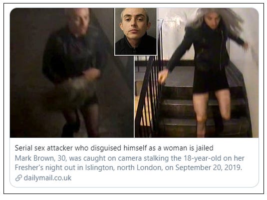 30 year old Mark Brown was caught on CCTV stalking his victim in North London late at night last September. While in ‘girl mode’, he grabbed her, threw her to the ground and sexually assaulted her. Out of prison on licence, Brown had previously been convicted of numerous similar offences, including seven sexual assaults on lone women.