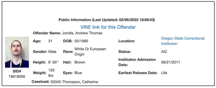 In 2010 Andrew Jondle conspired with his girlfriend to murder his parents for financial gain. He killed them both, stabbing his father with a farm scythe and bludgeoning his mother repeatedly with a metal pipe. The following year he pleaded guilty to two counts of aggravated murder and was sentenced to life in prison.