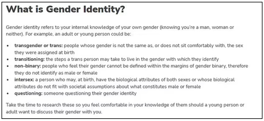 The volunteer section of the Scouts Association website provides information on ‘gender identity’. It advises that volunteers should ‘take time to research’ gender identities in case a young person (presumably a Scout member) wants to ‘discuss their gender’ with them.