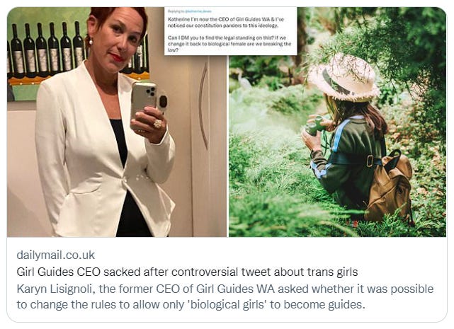 The Girl Guides WA constitution allows 'any person under the age of 18 years who lives their life as female' to become members. On Twitter Lisignoli asked women's rights lawyer, Katherine Deves, about the legality of changing that policy to restrict membership to biological females. She was subsequently removed from her post.