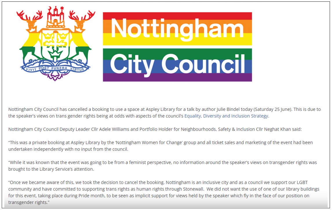 “Nottingham City Council has cancelled a booking to use a space at Aspley Library for a talk by author Julie Bindel today (Saturday 25 June). This is due to the speaker’s views on trans gender rights being at odds with aspects of the council’s Equality, Diversity and Inclusion Strategy... We did not want the use of one of our library buildings for this event, taking place during Pride month, to be seen as implicit support for views held by the speaker.”