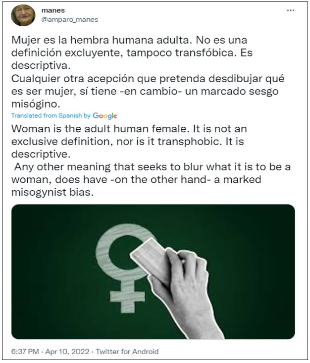 On Sunday 10th April, Mañes tweeted that a woman is an adult human female. “It is not an exclusive definition, nor is it transphobic. It is descriptive.”