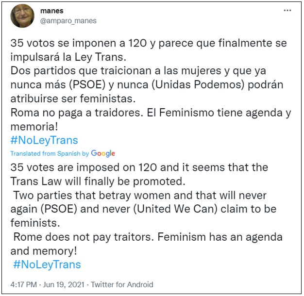 Last June the Spanish government approved a draft bill to allow anyone over the age of 14 to legally change their sex without requiring any medical diagnosis or treatment. Feminist campaigner, Amparo Mañes, made her opposition to this so-called ‘trans law’ clear from the outset and she has, of course, frequently been accused of transphobia as a result.
