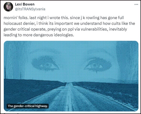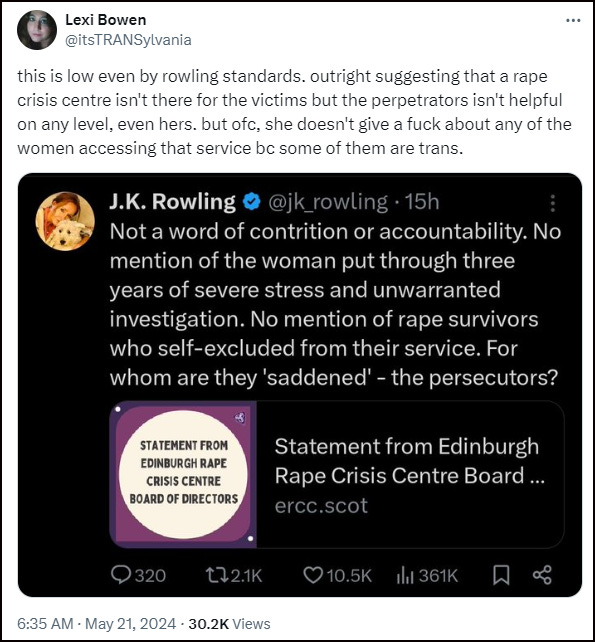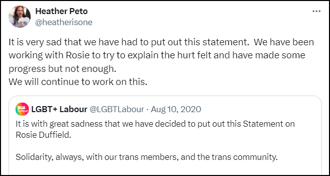 Ugh! I wish the mainstream media would stop being so complicit and report some of this. It would soon shock some of the "be kind" useful idiots. I am so sick of reading "let them be, they're not hurting anyone. What difference does it make?" etc. THIS! ALL THESE THINGS! THIS IS WHAT THEY DO! I very much worry for women's rights under two-tier Kier. After all Saville and Al-Fayed were both permitted to slip through the fingers of the CPS under his watch. Then there is the treatement of Rosie Duffield. Talk about not giving an eff about women.
