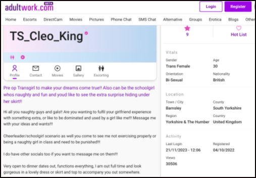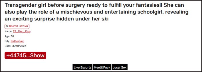 “Looking for a pre-op trans individual to fulfil your desires? Look no further! I can be your naughty schoolgirl, complete with a surprise under my skirt. Hello to all you adventurous individuals! Are you seeking a unique girlfriend experience or looking to be dominated by someone like me? …We can even roleplay a schoolgirl or cheerleader scenario where I can be your naughty student in need of punishment.”