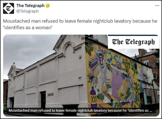 THE TELEGRAPH: A man was confronted trying to use the female toilets of a Leeds nightclub and claimed to ‘identify as a woman’.