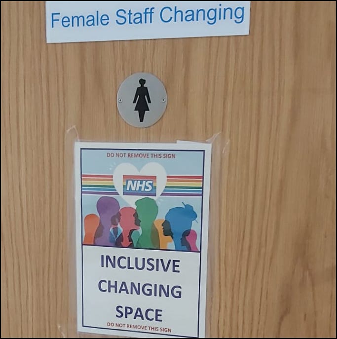 According to X/Twitter account @CConcern, the sign below appeared on the door to the female staff changing room this week, proclaiming it an ‘inclusive changing space’. (You will notice the two separate demands that the sign must not be removed.)