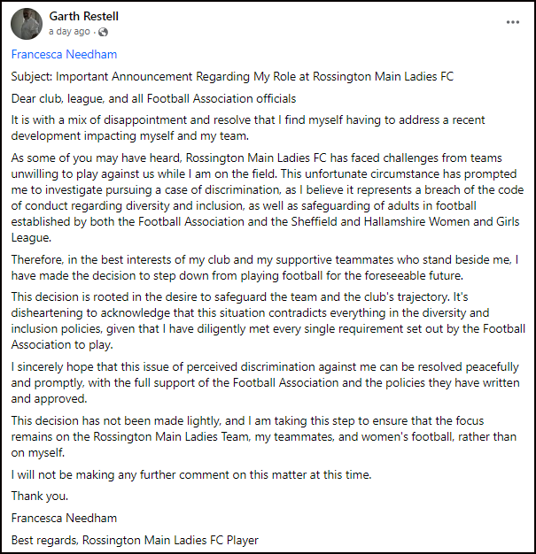 “Rossington Main Ladies FC has faced challenges from teams unwilling to play against us while I am on the field. This unfortunate circumstance has prompted me to investigate pursuing a case of discrimination…
