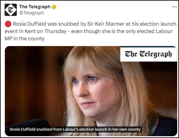 You may remember that Rosie Duffield was snubbed by Keir Starmer when the Labour Party staged its election launch in Kent, the county where she was the only elected Labour MP.