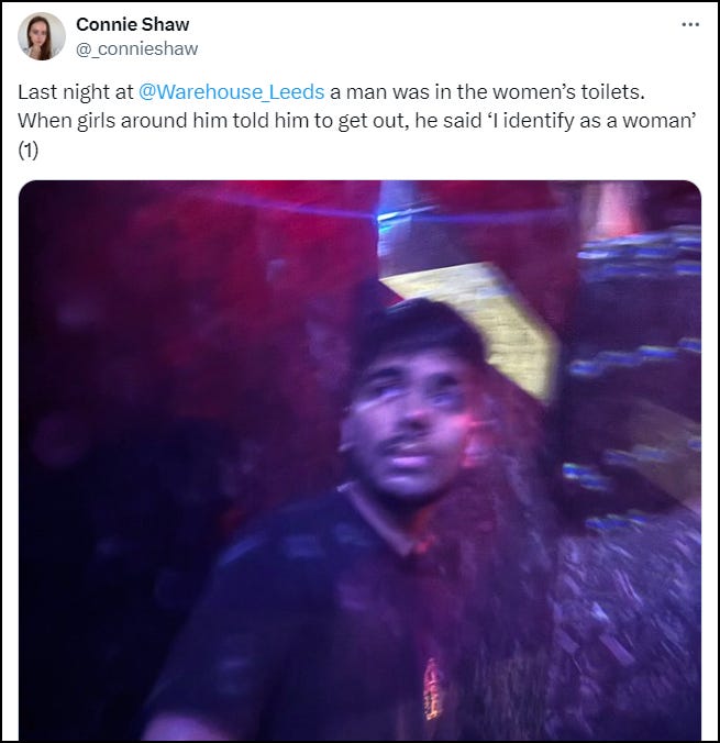20-year-old Philosophy student, Connie Shaw, was at the Warehouse nightclub in Leeds when she and a friend encountered a man with a moustache in the women’s toilets. When confronted, he claimed to ‘identify as a woman’ and refused to leave.