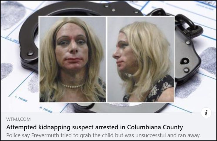 21WFMJ: In Ohio, a cross-dressing man who calls himself ‘Vicky’ has been arrested for attempting to snatch an 11-year-old boy from outside his own home.