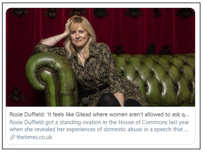 Rosie Duffield, of course, was one of the very few Labour MPs who dared to speak up in defence of women’s sex-based rights and spaces and she has suffered much for her bravery and her feminism. For years, she has been the subject of an ongoing witch hunt, erroneously accused of bigotry and transphobia. She has received untold harassment and abuse, even from within her own party.