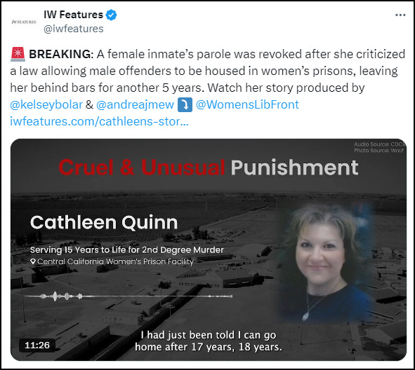 IW FEATURES: A female inmate lost her chance of parole after objecting to the law which enforces women to be incarcerated with trans-identified males.