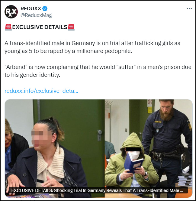REDUXX: A trans-identified male is on trial in Germany, accused of trafficking very young children for the purposes of sexual abuse.