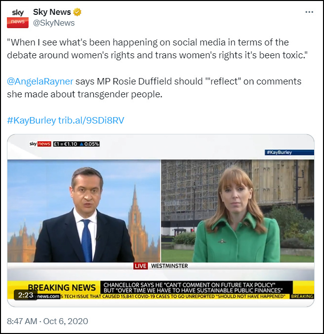 In October 2020, Rosie Duffield told The Times that discussing women’s rights is almost impossible within the Labour Party and that women are being silenced. “The vast majority of my colleagues are afraid to even raise it as a subject that we should be talking about… It’s just a vehicle to attack women in public. I feel like my female mouth is being well and truly closed without ever actually having been opened.”