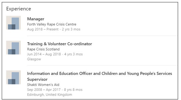 According to his LinkedIn profile, he is the manager of Forth Valley Rape Crisis Centre.