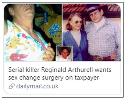 THE DAILY MAIL: A story from Australia, murderer Reginald Arthurell is due to be paroled this week and will be seeking “gender reassignment” surgery on his release.