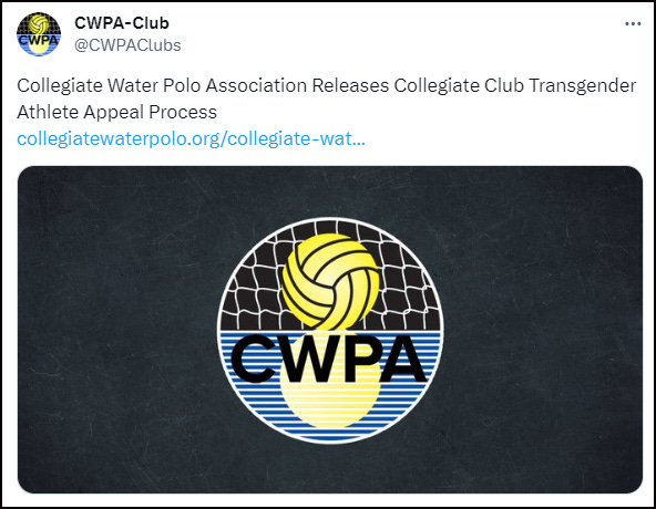 The Collegiate Water Polo Association (CWPA) has issued its guideline regarding transgender inclusion in its competitions. Trans identified male athletes can compete in the CWPA Women’s Club League. They need to submit a letter confirming their ‘gender identity’ and medical validation confirming testosterone suppression. Despite retaining all the physical and physiological advantages bestowed by their sex, they are then eligible for women’s events.