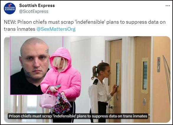 However, “Critics say the change means the SPS is deliberately avoiding legitimate scrutiny of a controversial and inherently dangerous policy… The public will in future be kept in the dark about how many potentially violent trans women – men self-identifying as female – are being allowed to serve time alongside vulnerable women”.