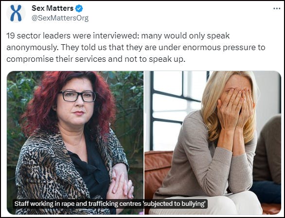 This week Sex Matters published a shocking new report, Women’s Services: A Sector Silenced. It details how “Leaders in the women’s sector who advocate for female-only services are routinely subjected to investigations, ostracisation, bullying and employment loss, and have been pressured into adopting policies that compromise women’s welfare and safety”.