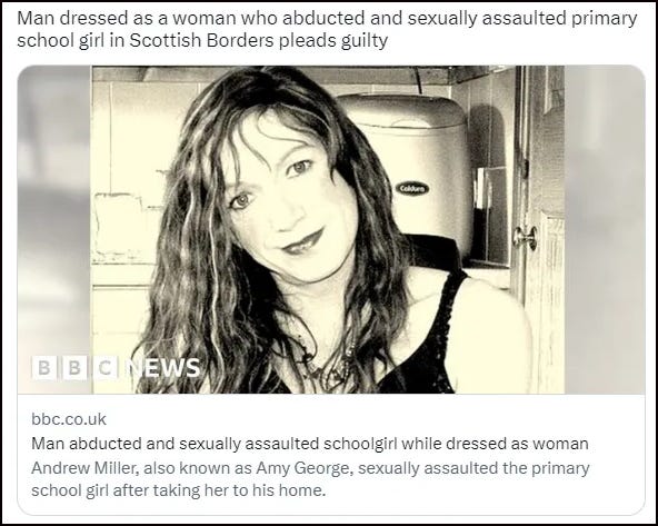 53-year-old Andrew Miller is a former butcher and trans-identified male who used to call himself Amy George. Last year he pleaded guilty to abducting and sexually assaulting an 11-year-old schoolgirl.