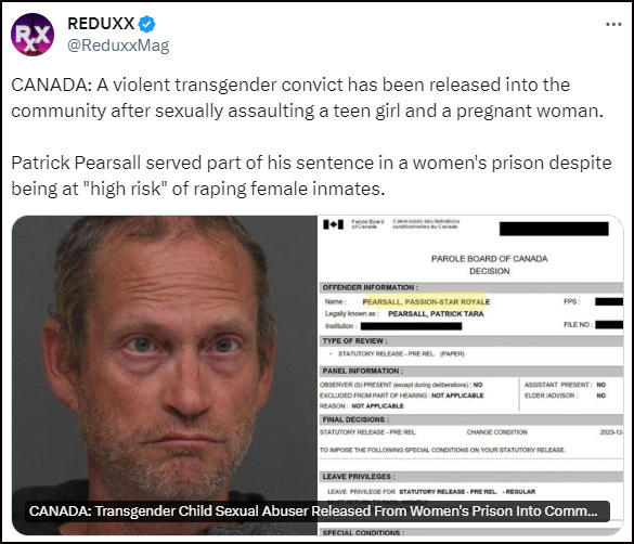 Now Pearsall is at large in the community again and, even though he’s been barred from a female halfway house, thanks to Canada’s complete ideological capture and self-ID laws, he is likely to have unfettered access to women’s spaces in the future.