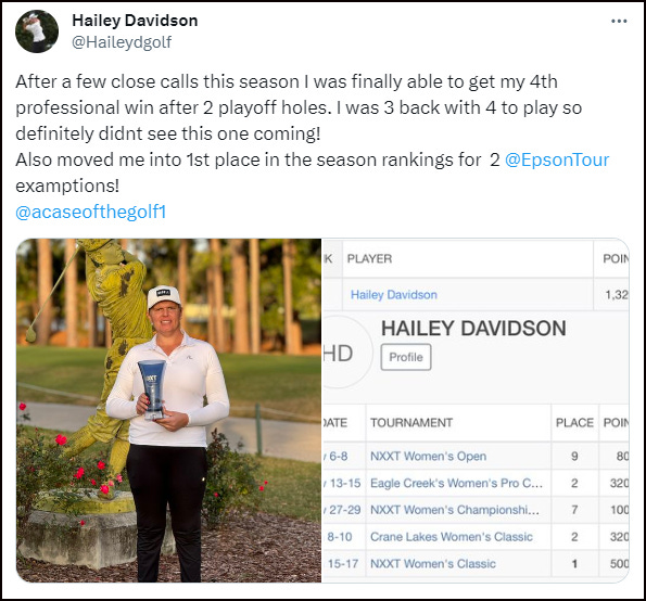 This week Davidson won the NXXT Women’s Classic at Mission Inn Resort and Club in Orlando, Florida. His victory is not only unfair, it has particular significance; this year NXXT has partnered with the Epson Tour to award ten exemptions to their top five players. (A golf sponsor exemption is a special invitation from a tour event’s lead sponsor to a non-qualifying player who will be exempt from the competition’s qualifying criteria.) Davidson’s win means he is currently ranked in first place to receive two of the ten sponsor exemptions available. Epson is the qualifying tour for the LPGA, the tour card Davidson has set his sights on.