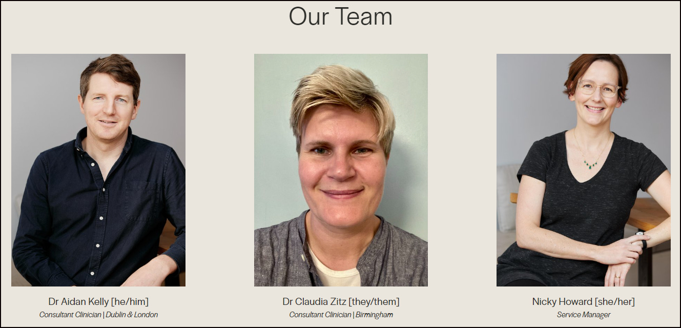 Gender Plus founder and consultant clinician is Dr Aidan ‘he/him’ Kelly about whom we’ve reported in the past. He worked at the Tavistock’s Gender Identity Development Service (GIDS) between 2016 and 2021. According to the Gender Plus website, Dr Kelly, a member of WPATH, “Has specialist skills in the assessments of gender identity needs and making recommendations for gender affirming medical treatments”.