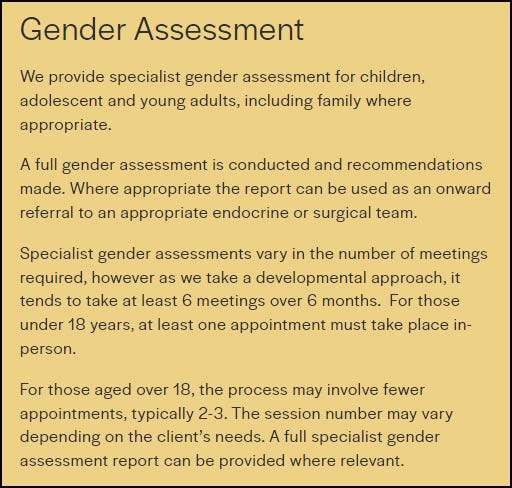 The clinic is part of Gender Plus, a private gender service which has bases in London, Birmingham and Dublin. It describes itself as providing ‘specialist gender assessment’ for ‘children, adolescents and young adults’ and states that “Our practice is guided by WPATH (World Professional Association for Transgender Health) Standards of Care”.