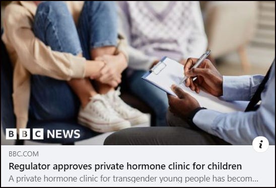 The clinic’s CQC approval means it will now be able to prescribe cross-sex hormones to teenagers over the age of sixteen, apparently after as few as just six appointments, only one of which needs to be in person.