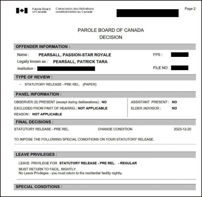 The parole board’s statement suggests that Persall was accused of assaulting a female prisoner while accommodated in a women’s prison. “Even within correctional institutions, you have demonstrated a pattern of problematic institutional adjustment, including a recent allegation of sexual assault against a prisoner at [redacted] institution which resulted in your transfer to another institution”. The statement continues, “Without personal change, which you have shown resistance to (most especially in the area of sexual offending), your risk to women and girls remains largely unmitigated”.