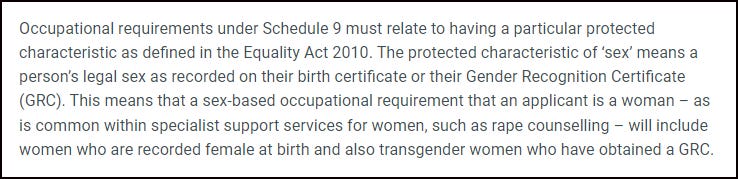 The guidance goes on to say “Schedule 9 also permits an occupational requirement to exclude transgender persons where it is objectively justified, and this can include those who have obtained a GRC”. However, as Sex Matters point out, this is only going to cause confusion and will lead to trans-identified males applying for and even taking roles which are entirely inappropriate for any male - regardless of the documentation he may hold - to be undertaking.