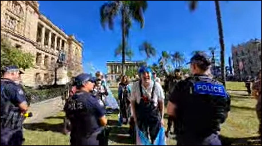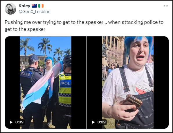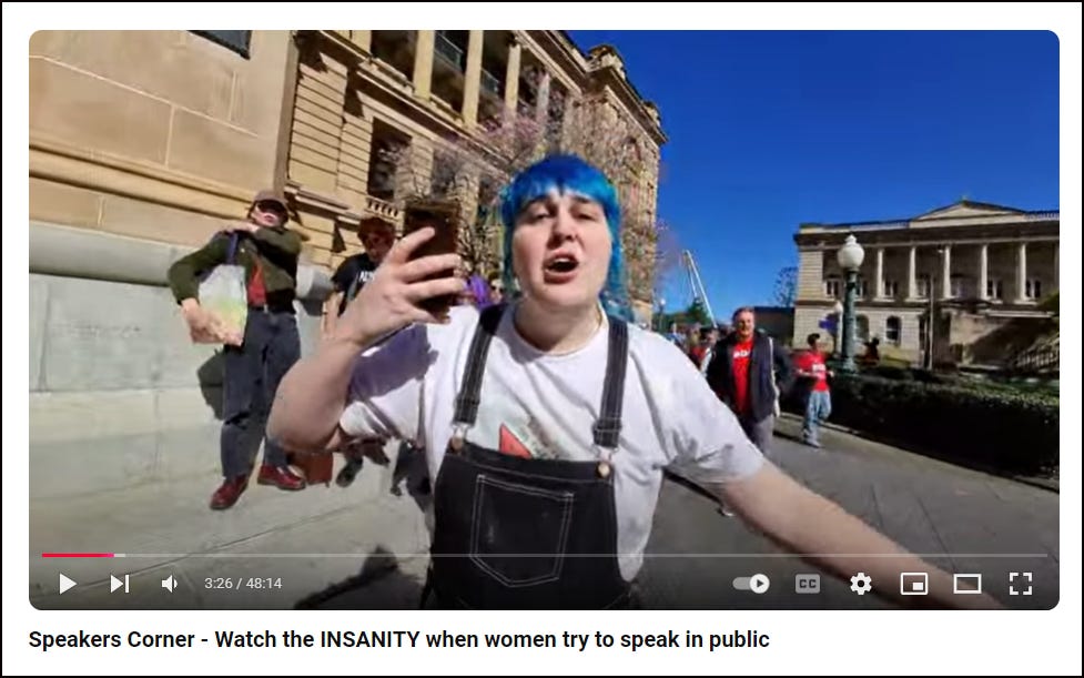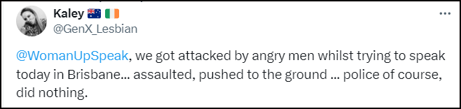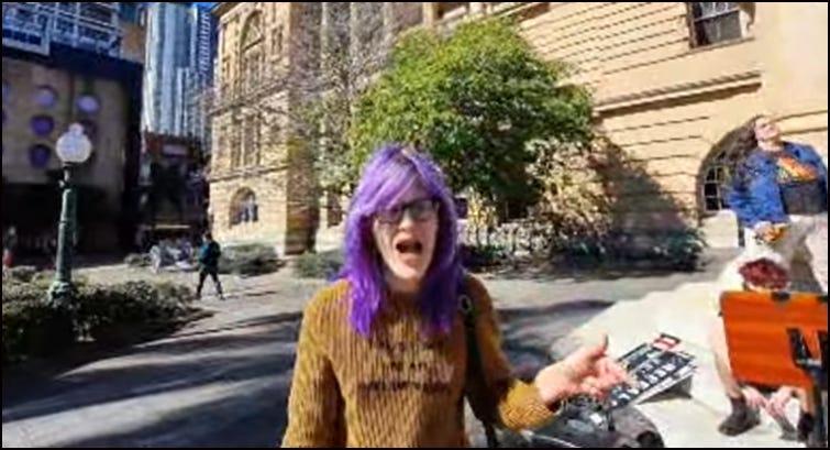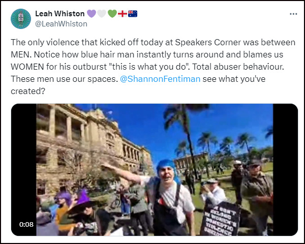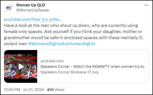 Australian women’s rights group, Woman Up Queensland, held a Speakers Corner event in Brisbane this Sunday. Inevitably, the meeting was besieged by (mostly male) trans activists. They barged into the area where the group had set up their equipment and disrupted the women speakers, shouting abuse, insults and insane hyperbole.
