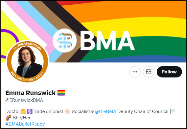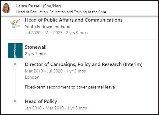 Laura ‘she/her’ Russell is currently the BMA’s Head of Regulation, Education and Training but previously worked for Stonewall for two and a half years. Russell was one of the Stonewall employees cited in the legal action brought by Allison Bailey.