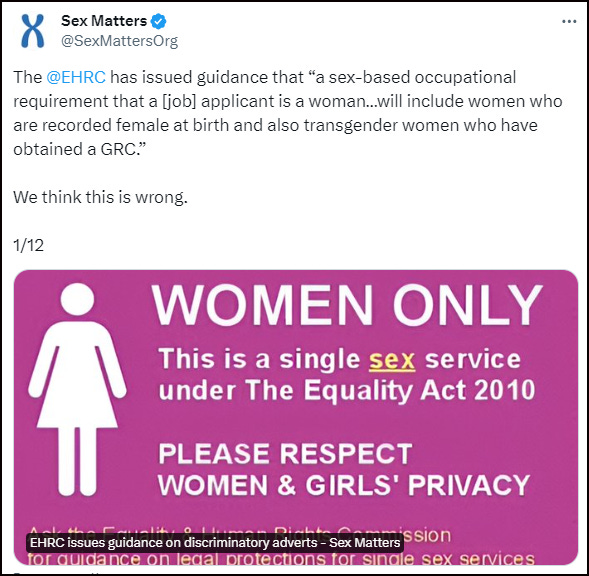 This week, the EHRC has issued updated guidelines on ‘discriminatory adverts’ and stated that when a role is advertised as ‘female only’ this can include trans-identified males who have a Gender Recognition Certificate.