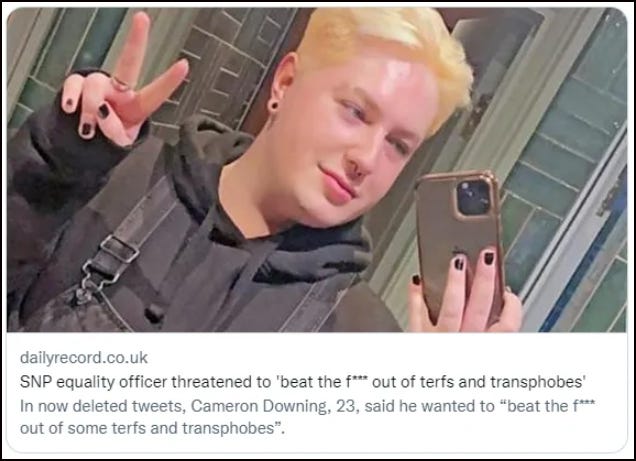 We have written previously about 24-year-old Cameron ‘he/they’ Downing who identifies as ‘non-binary’. Two years ago he was appointed the SNP Equalities Officer at the party’s London branch.