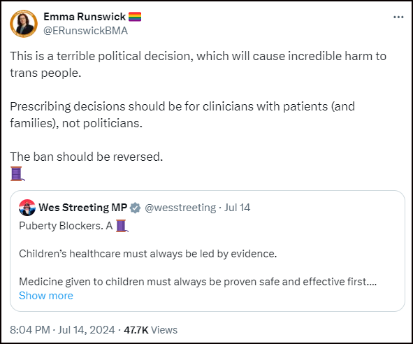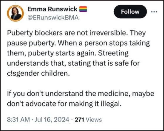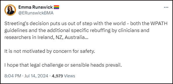 Months after the publication of the Cass Report and despite the ever-burgeoning evidence to the contrary, she commented on social media that “Puberty blockers are not irreversible”.